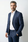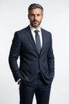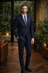 O Terno Masculino Poliviscose Azul Marinho Xadrez é um Costume que apresenta base azul marinho de tonalidade profunda com padrão xadrez janela, sutilmente integrado ao tecido. As linhas finas formam o quadriculado com contraste discreto, criando textura sofisticada e aparência mais sóbria. A lapela tradicional pespontada reforça o contorno do paletó com acabamento marcado e proporção clássica.